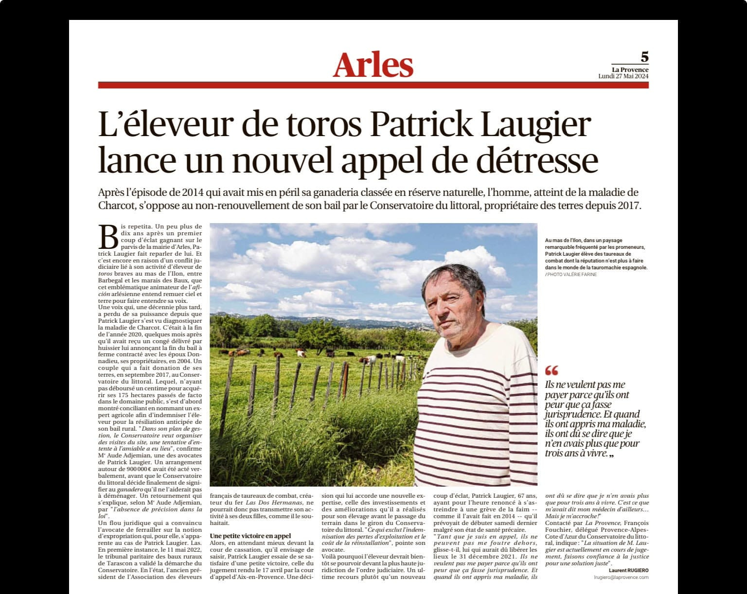 Depuis plusieurs semaines, la famille LAUGIER qui élève des toros sur le site du mas de l’Ilon, est à nouveau menacée d’expulsion. Cette expulsion, si elle venait à se réaliser, viendrait signer la disparition pure et simple d’une ganaderia française. Vous trouverez ci-dessous des éléments d’appréciation de la situation (article paru dans La Provence et la lettre ouverte de Patrick Laugier).